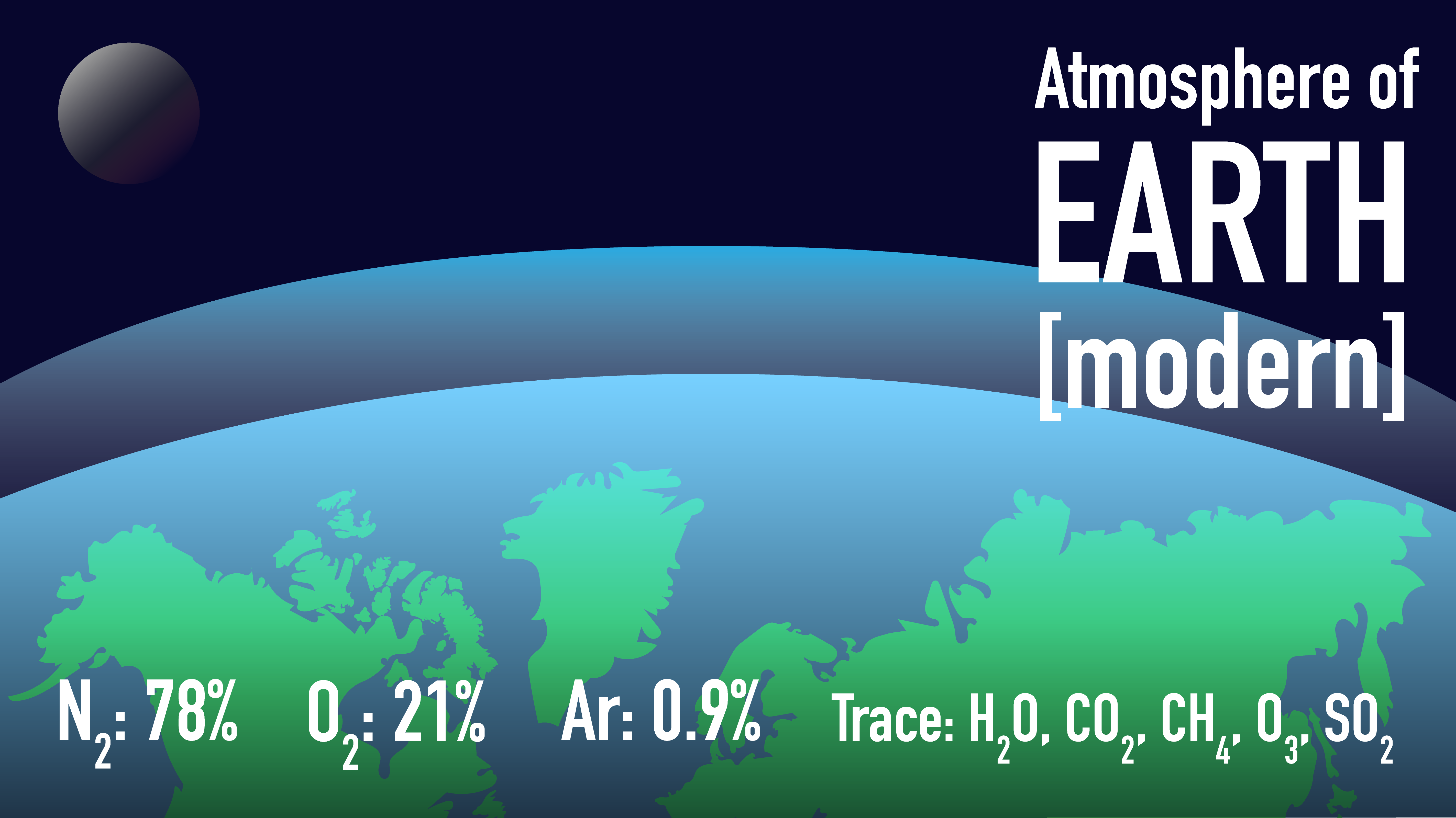 A: The Earth’s atmosphere today is composed of 78% nitrogen (N2), 21% oxygen (O2), 0.9% argon (Ar), and trace amounts of water vapor (H2O), carbon dioxide (CO2), methane (CH4), ozone (O3), and sulfur dioxide (SO2).