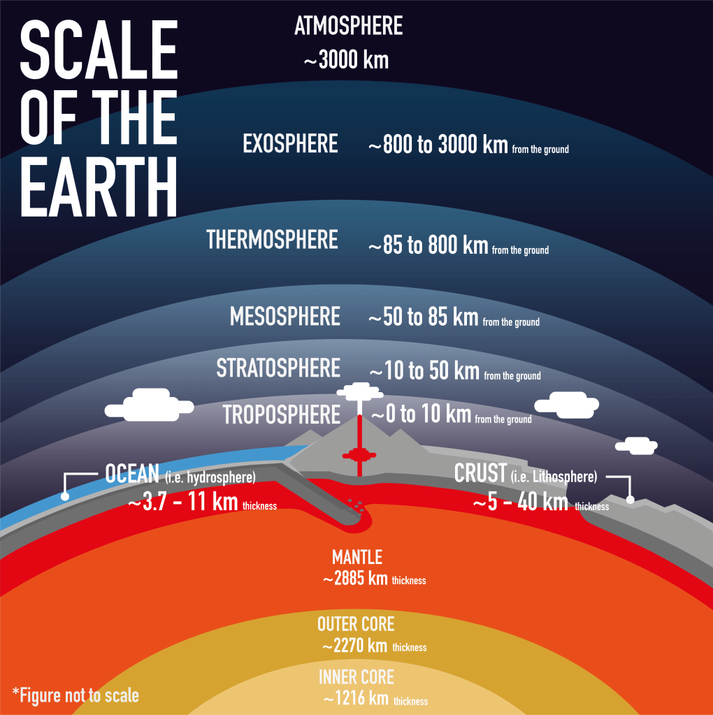 Earth’s atmosphere has a thickness of ~3000 km and can be divided into three major layers: troposphere (0 to 10 km above ground), stratosphere (10 km to 50 km above ground), mesosphere (50 km to 85 km above ground), thermosphere (85 to 800 km) and exosphere (800 to 3000 km; data from World Atlas). Each of these layers hold different properties: e.g., differences in density, composition of gas, temperature etc.