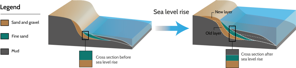 From studies of modern water bodies, we know that sediments precipitate over time in horizontal layers that laterally extend until they meet a physical boundary. We also know that changes in the physical or chemical conditions predictably cause variations in the structure of rock units. For example, as the sea level rises, sand or gravel deposits at the coast of a beach will be replaced by fine mud so that over time layers of sand will be overlain by muds (Figure 3). If the change in sea level occurred globally, we would expect to see a similar order of sediment layers at various geographic locations and consider such rock successions similar in age. In addition, rock strata commonly contain fossils of animals and plants that lived during sediment accumulation but became extinct at some point in time. Therefore, rocks containing the same fossils have similar ages and are correlatable in time, even if the rock type and locality are different.