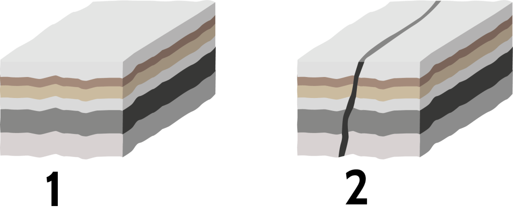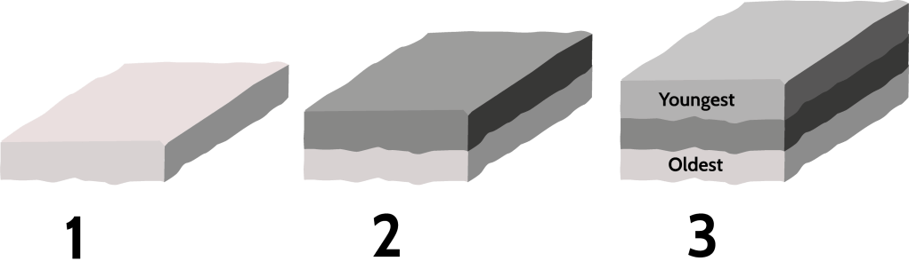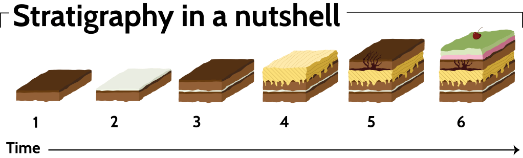 Relative dating is one of the geologic methods used to determine the relative order of events by comparing variations in rock units or fossil fauna (i.e., ancient animal life) and flora (i.e., ancient plant life) they contain. Relative dating follows the theory of “Uniformitarianism” that was initially developed by a Scottish geologist, James Hutton, in his 1785 book, “Theory of the Earth, with proofs and illustrations.” This philosophical idea laid the foundation of geology and makes an assumption that processes and natural laws that operate in the present also operated in the past. As time always moves forward younger sediments (i.e., a precursor to a rock; refer to the rock cycle) lay atop older ones – just like a layered cake (Figure 2). Such rock successions are referred to as strata or stratum for singular, which means a series of layers of rocks on the ground. The study of rock strata is called, “stratigraphy,” and branches into litho- and bio- stratigraphy. Lithostratigraphy is a study of rock layers and its compositions, and biostratigraphy is a study of fossils (remains or traces of ancient life) in rock layers.