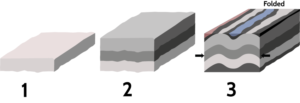 The principle of horizontality states that due to gravity, layers of sediments (solid natural materials, e.g., mineral grains) are deposited initially horizontally (Figure 6). This pretty much means that sedimentary rocks lay on top of each other like a stack of pancakes, unless other physical forces (like cutting through a pancake stack) alter the original layering and cause faulting or folding of the sedimentary beds.