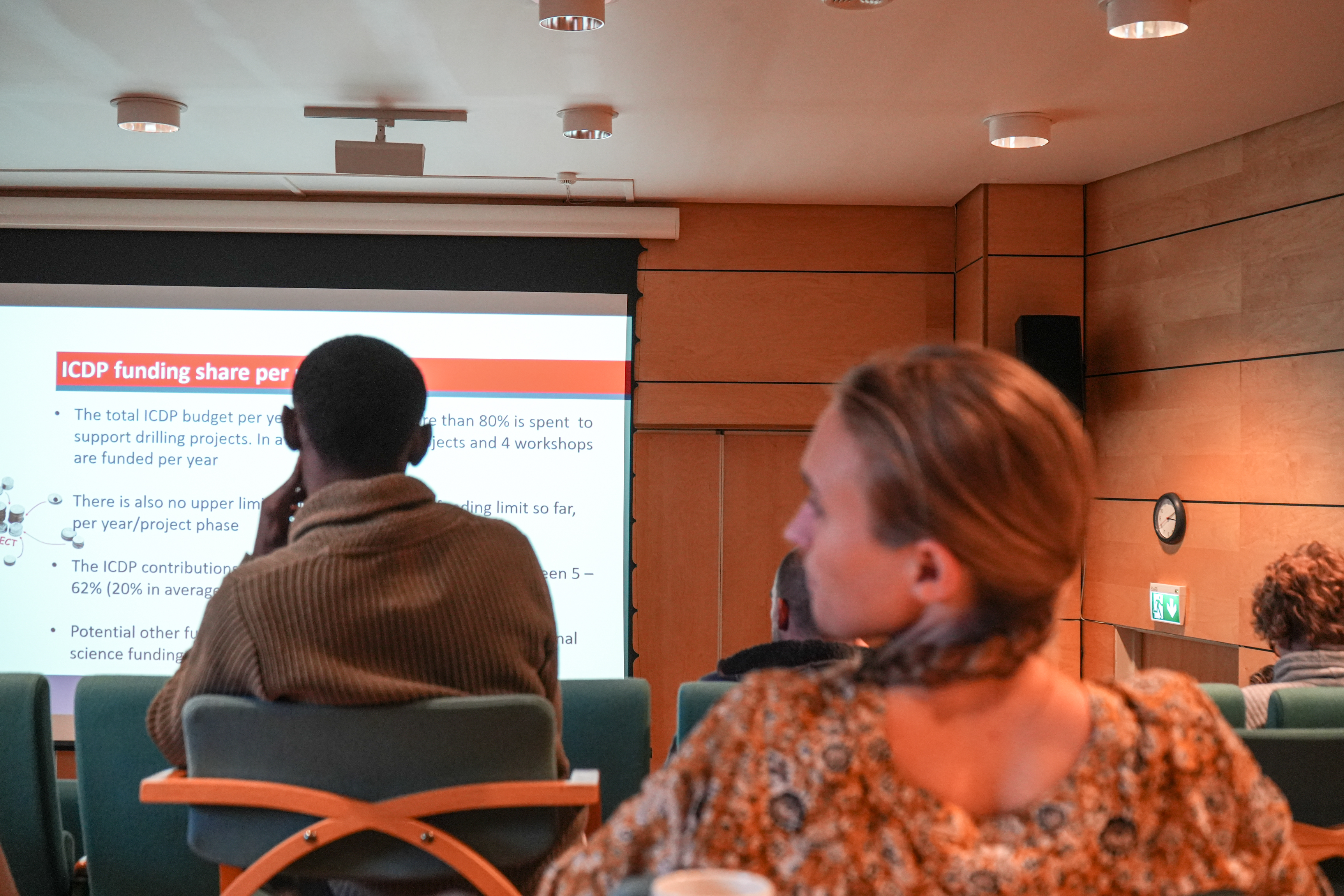 After the breakout sessions, the theme leaders and participants gathered to compile a rough outline of the final ICDP proposal. The working groups (from the breakout sessions) summarized questions and hypotheses into one draft document, which the workshop participants then discussed in detail. The drafted document was modified and finalized after considering all inputs from the open discussion. Another critical aspect was to identify possible funding avenues to supplement the potential ICDP funds from workshop members, as those cover a portion of the total drilling costs (Figure 9). Once the meeting came to an end, everyone gathered for a lovely dinner in downtown Trondheim to enjoy the company of Earth history enthusiasts before parting ways.