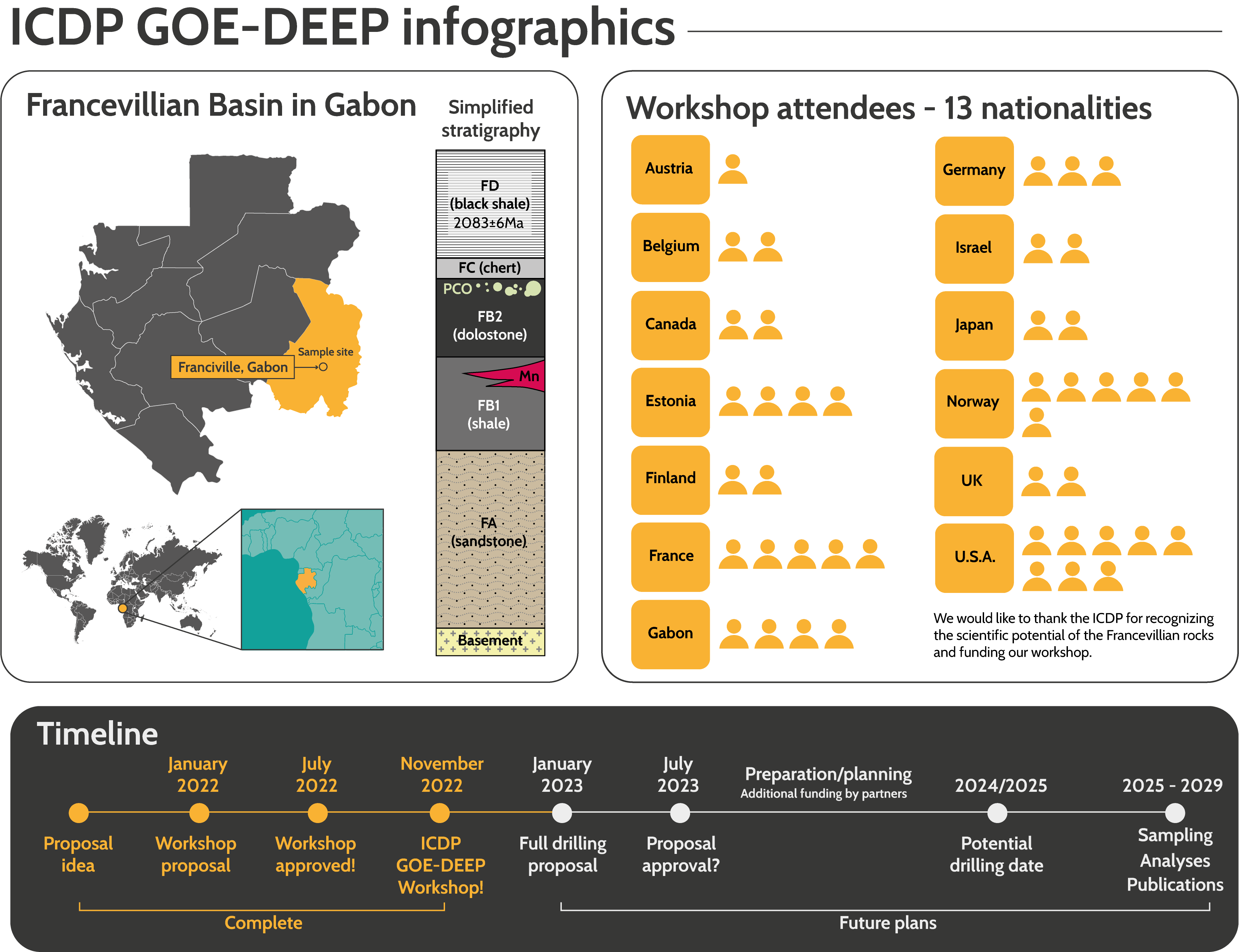 This past November, over 45 scientists and industry members from 13 nationalities gathered at the Geological Survey of Norway (NGU) in Trondheim to participate in the International Continental Scientific Drilling Program’s (ICDP) thematic workshop-the Gabon and Oxygenation of Earth – Drilling Early Earth Project (GOE-DEEP). The shared interest in the time when Earth first accumulated significant oxygen in the atmosphere and the following environmental consequences unite this diverse group of people. This interdisciplinary collective’s broad expertise challenges previously proposed ideas as well as assist in resolving the debate surrounding the timing, magnitude, and significance of Earth’s early oxygenation and its impact on emergence, diversification and evolution of life. However, accessing the records of the Earth’s ancient history is an immense task. With the support of the ICDP, such endeavors become possible. Here we will discuss (1) what is ICDP, (2) what did we accomplish during this workshop, and (3) what are we trying to achieve?